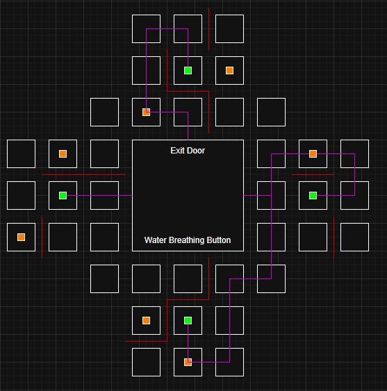 Now we arrive to one of the hardest parts, the conduits. There are four conduits in total, and you have to break each one in order to summon the boss. In the boss area, there is a central chamber, and then underwater catacombs. These are big, and there is a very real chance you drown in them and end your run. The image below shows the layout of the catacombs, along with routes. you must click the button on the rim of the central chamber, then dive into the water, going to the catacombs. Only do one conduit at a time, and take the same exact route out.